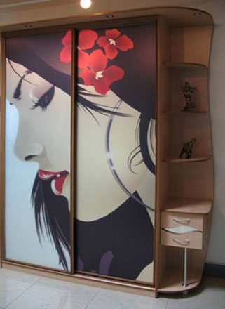 Корпусный шкаф-купе Корпус: ЛДСП Двери: Стальная система НАЙДИ, профиль кэшированный в цвет дерева, полноцветная печать Bonarty на стенке – парный рисунок. Фигурная консоль с тумбой, декоративная подсветка. Стоимость: от 43 000 рублей.