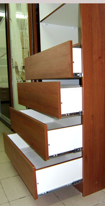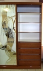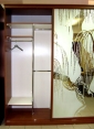 Стандартный шкаф-купе серии «Премиум». Фасад по индивидуальному заказу: зеркало серебро с нанесенным пескоструйным рисунком № 120 на обе двери. Щетка буферная по краям дверей. Внешняя конструкция шкафа — ДСП орех, внутренняя конструкция ДСП белое. Края обработаны кромкой ПВХ 2 мм. Профиль алюминиевый Simline орех. 4 выдвижных ящика на шариковых направляющих полного выдвижения.